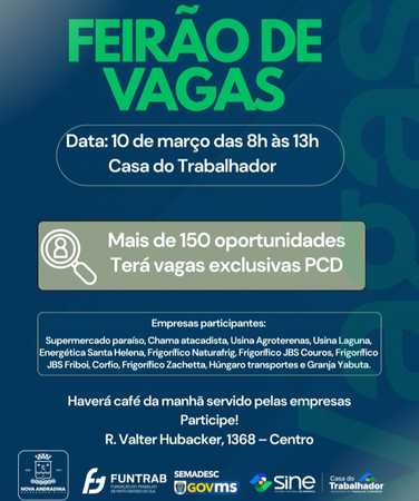 Em um cenário em que a geração de oportunidades se torna cada vez mais essencial para o fortalecimento da economia local, Nova Andradina promove nesta terça-feira (10) mais uma iniciativa voltada à inserção de trabalhadores no mercado de trabalho. A Casa do Trabalhador realiza o Feirão de Vagas, reunindo empresas de diferentes segmentos produtivos e ofertando mais de 150 oportunidades de emprego para ambos os sexos, inclusive destinadas a pessoas com deficiência (PCD).